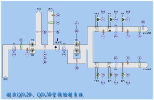 在上位監(jiān)控微機(jī)上顯示中央空調(diào)的整個(gè)工作狀態(tài),如工藝流程圖、動畫構(gòu)件、空氣流動塊、過程參數(shù)、安紐設(shè)置。