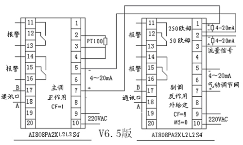 正確接線(圖二),注意信號方向,設(shè)置參數(shù):副調(diào):AI-808AXL2、流量量程標(biāo)度1.60T/h、設(shè)定值0.80T/h(系統(tǒng)正常運行時的流量值)。dF=2、Ctrl=1、Ct1=1、Sn=32、dIP=2、dIL=0、dIH=1.60T/h、OPI=4、CF=8(反作用、外給定功能)、dL=2、可設(shè)置正、負(fù)偏差報警。主調(diào):AI-808AXL2、傳感器熱電阻,設(shè)定值40℃、Ctrl=1,dF=0.2、Ct1=4、Sn=21、dIP=1、OPI=4、CF=1(正作用)、dL=2、可設(shè)置上、下限報警、正、負(fù)偏差報警。(圖二)